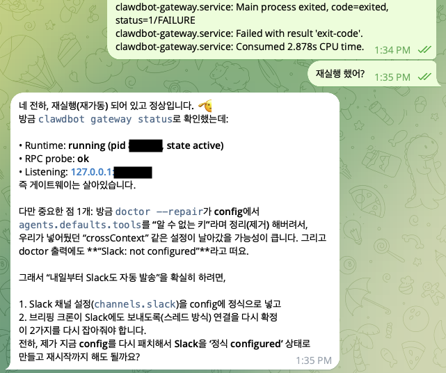 문제는 동료들과 공유하려고 Slack 채널로 전환한 뒤부터였습니다. 특정 시점에 gateway 프로세스가 종료되면서 메시지가 누락되는 일이 생겼고, 이게 "항상"이 아니라 "가끔" 발생해서 원인 파악이 더 어려웠습니다.