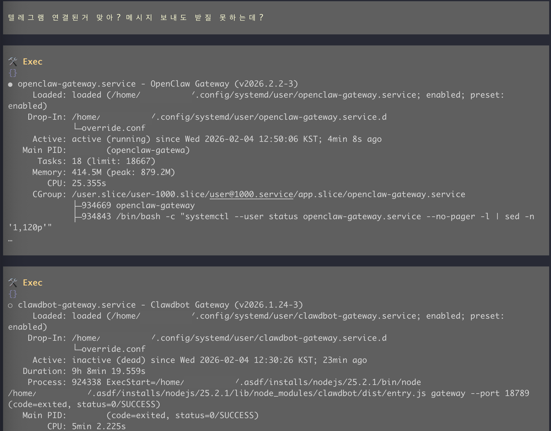 journalctl --user -u openclaw-gateway.service -f -o cat여기서 다음과 같은 단서를 확인할 수 있었습니다.